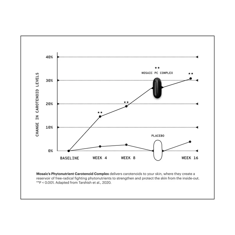 After only two weeks, your circulating carotenoid levels may be significantly higher, providing nourishment to your whole body. Proven results of increased skin moisture content and improved skin texture may be visible at 3 weeks with a Corneometer CM 825, the gold standard for assessing skin moisture content in the clinical setting. In just 4 weeks, the carotenoid levels in your skin may have increased by 15%, building up a natural reservoir of free radical-fighting phytonutrients in skin tissues to help protect collagen. With just a single daily softgel for 12 weeks, you may see improvements in skin smoothness, elasticity, dryness, and barrier function. At 16 weeks, you’ll have 31% higher carotenoid levels in your skin, leading to improved tone, brightness, radiance, and a reduction in the appearance of both deep and fine wrinkles. As you continue to take Mosaic, it will continue to support whole-body skin health. Individual results may vary. This timeline may differ from the typical purchaser’s experience, and is not intended to represent or guarantee that anyone will achieve the same or similar results.